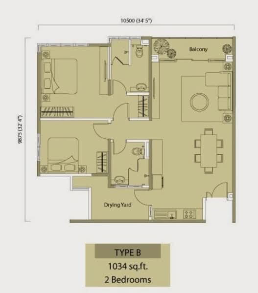 2 bedrooms, 2 bathrooms, 1 parking, 1 balcony in living hall, 1 back yard