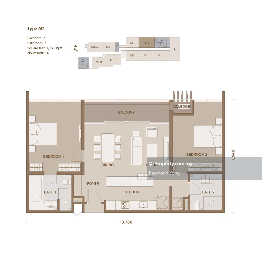 Type M2 1163 sq ft 【2 Bedroom 2 Baths】