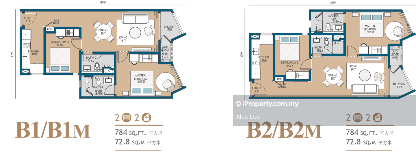 B : 784sf - 2 rooms + 2 baths