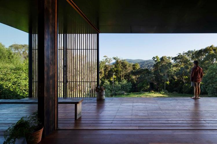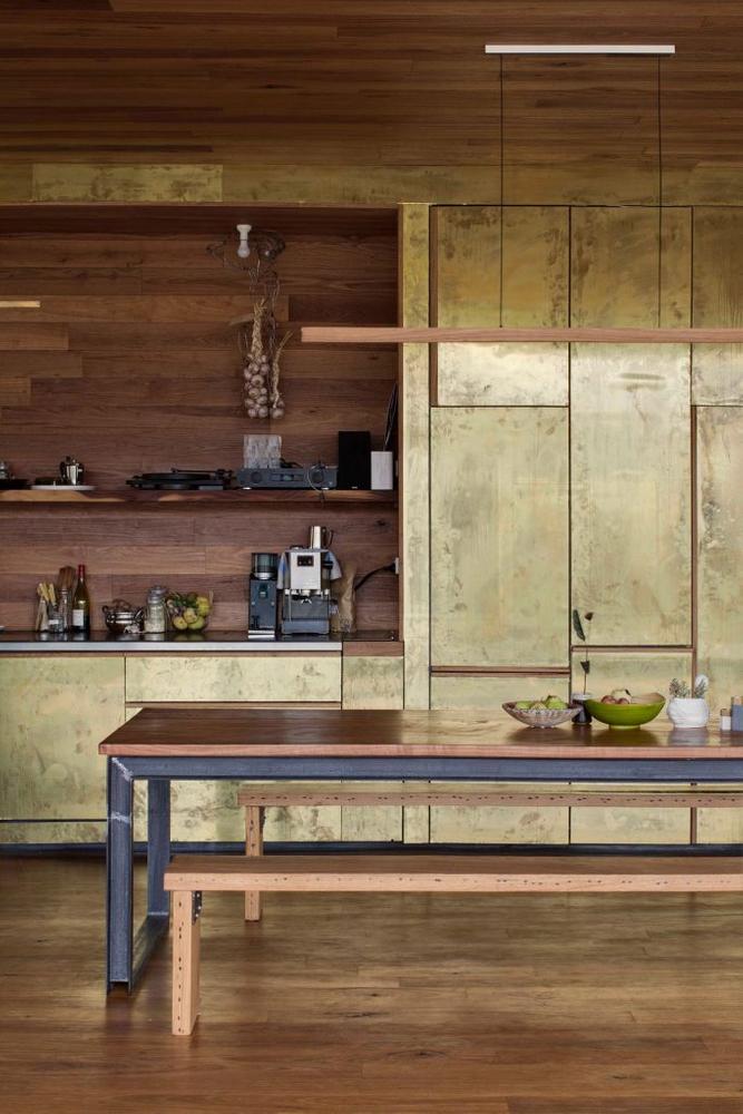 Inside, the abode features a cosy tapestry of woods like red stringy bark and narrow leaf peppermint timbers, which look magical against the brass sheeting that runs along the entirety of the interior kitchen wall.