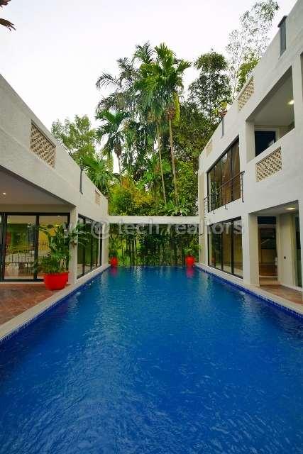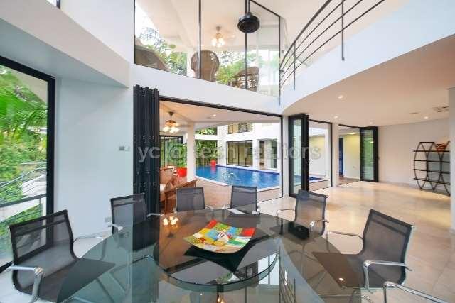 DESCRIPTION: A beutiful designed comtemporary and resort-style 3.5 storey bungalow with infinity swimming pool sits on a rectangular piece of slope land at back and back portion surrounded by mature forestry for alots of privacy and combining the serenity of the surrounding elements, It has been recently restored with superior marble material and furnishing , impeccable maintained inside and out. Extensive of Glass throughout and double volumn high ceiling give abundance of natural lights and create an elegant feeling of space and dimension. Truely a private onsis in Kenny Hill. Also it is designed by a local famous architect