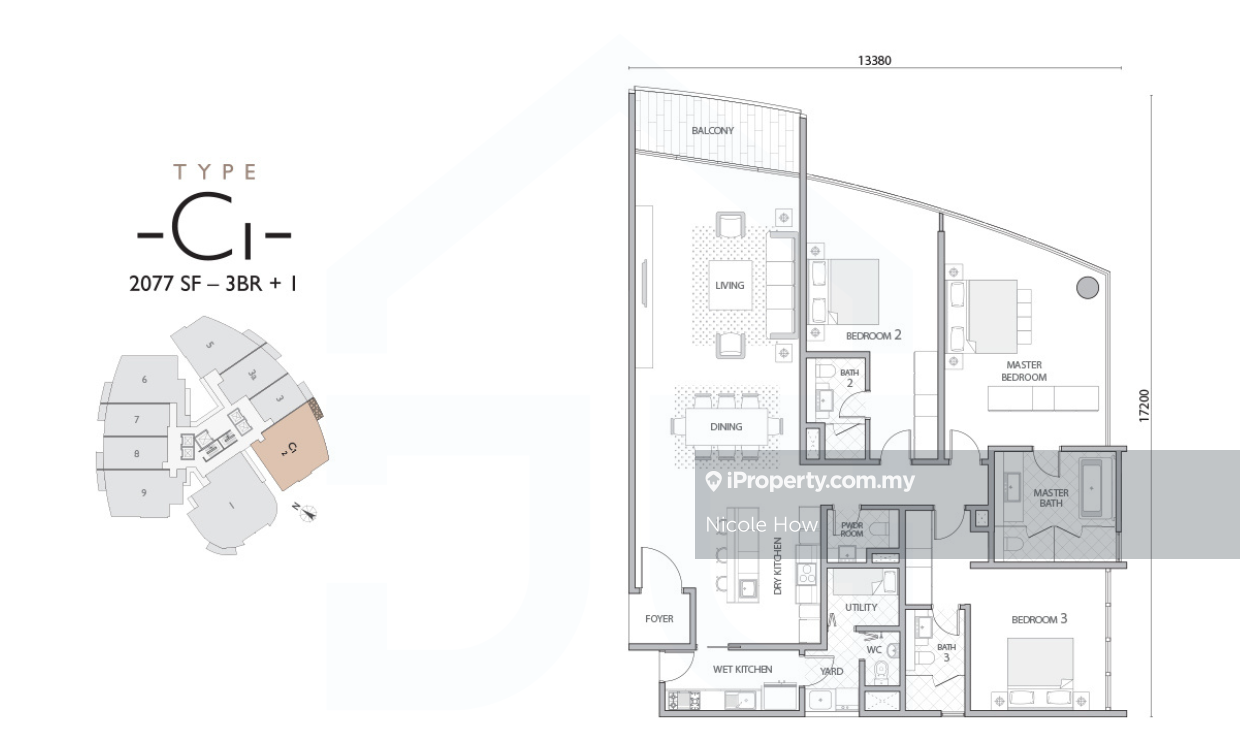 This floor size of this unit is 2,077 sqft.