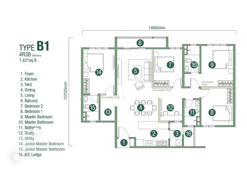 This floor size of this unit is 1,421 sqft.