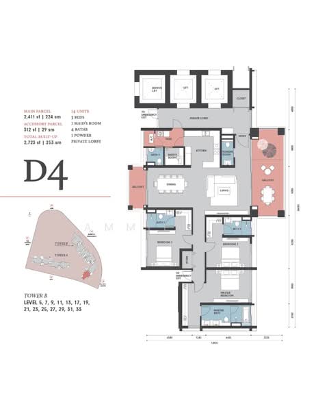 -3 bedrooms 1 maid room 4 bathrooms 1 powder room