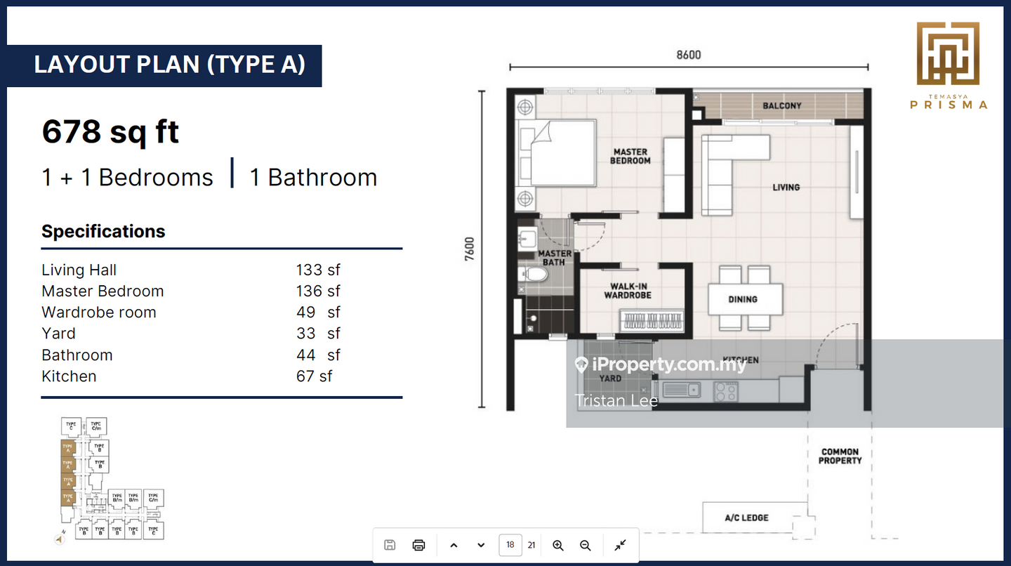 This floor size of this unit is 678 sqft.