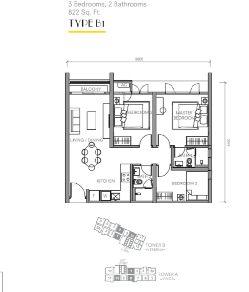 Unit type :822SQFT 3ROOM