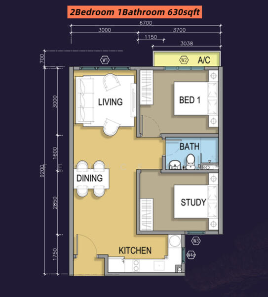 This floor size of this unit is 630 sqft.