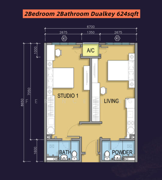 This floor size of this unit is 624 sqft.