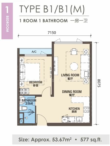 This floor size of this unit is 577 sqft.