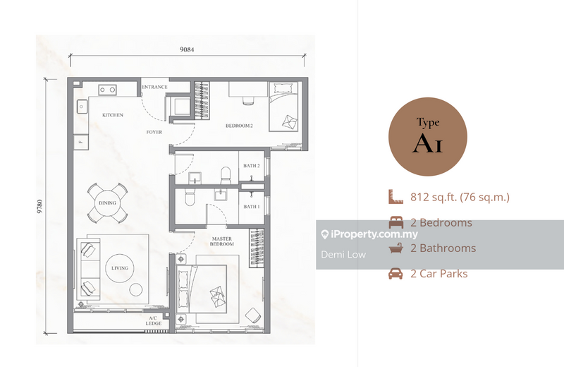 • Type A1 – 812 sqft | 2 Bedrooms, 2 Bathrooms