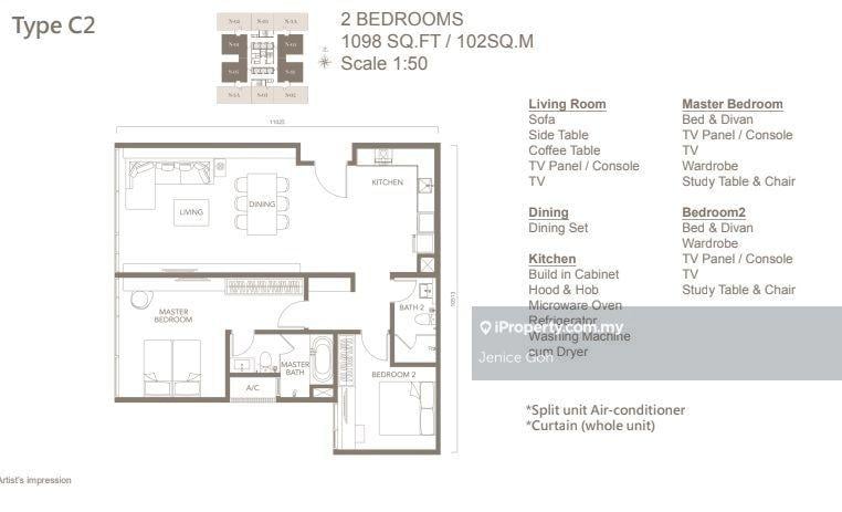 This floor size of this unit is 1,098 sqft.