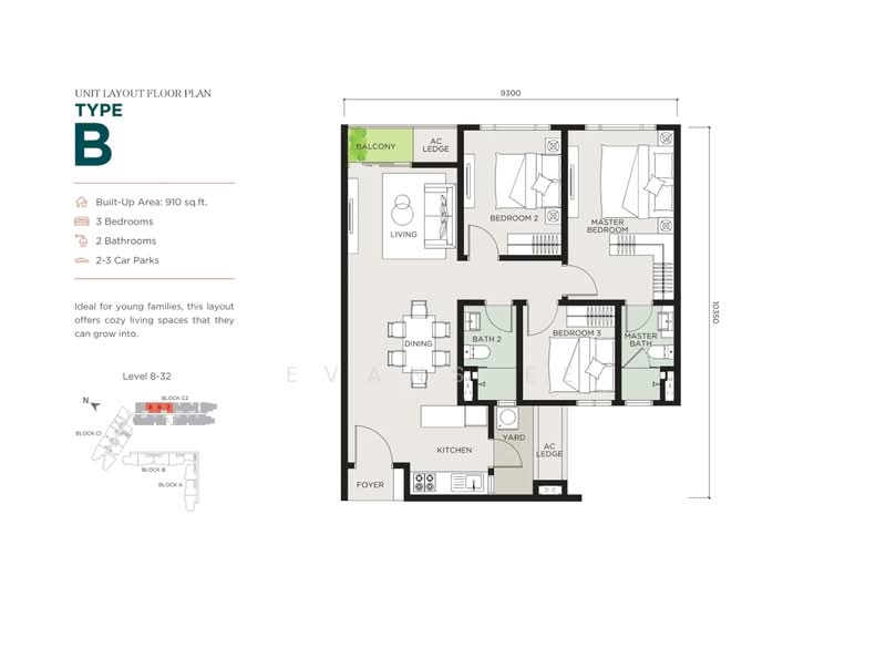 Type B - 910 Sqft - 3ROOM2BATH