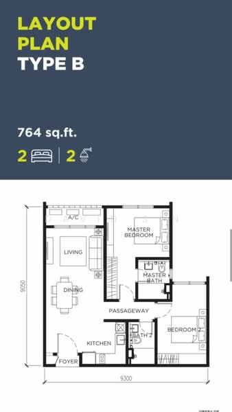 This floor size of this unit is 764 sqft.