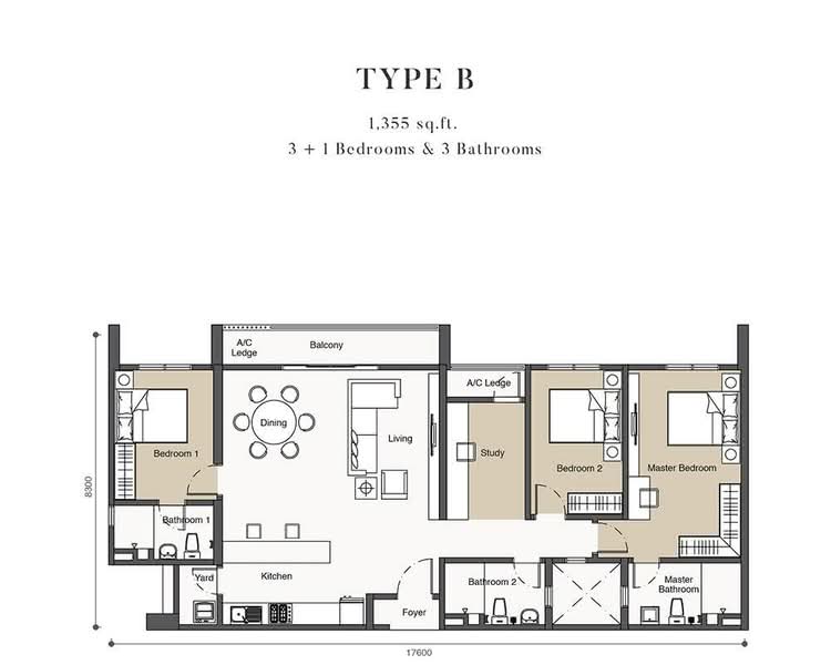 ~3 rooms + Study area, 3 bathrooms