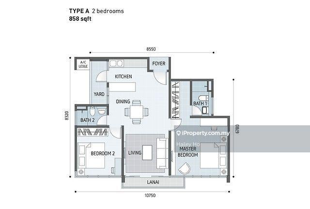 This floor size of this unit is 858 sqft.