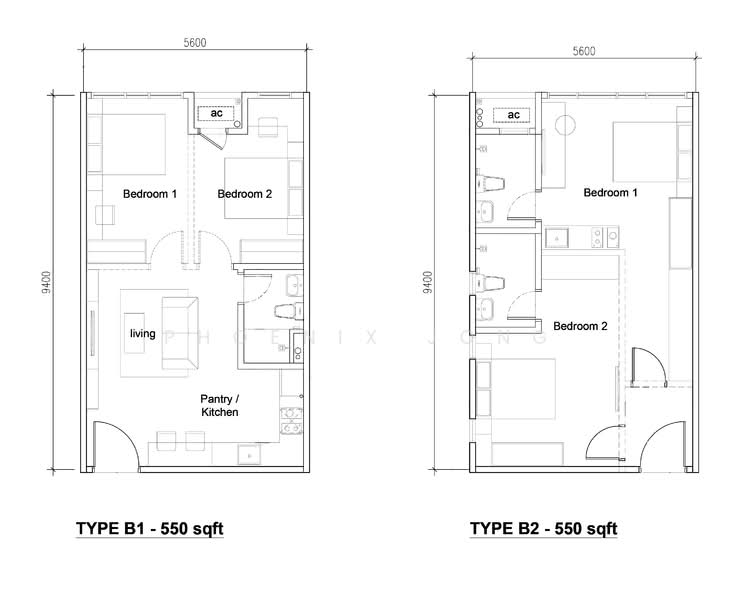 - Type B2 (550sqft, 2 bedrooms, 2 baths, 1 carpark, corner unit, dual key).