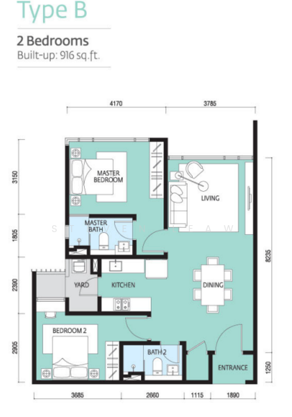 This floor size of this unit is 915 sqft.