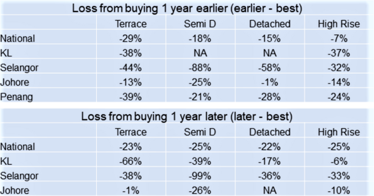 - 如果你无法在最好的时机(年份)购买房地产,而是在早一年或晚一年购买的话,“损失”可能会很大, 而具体的“损失”取决于房产类型和地点。